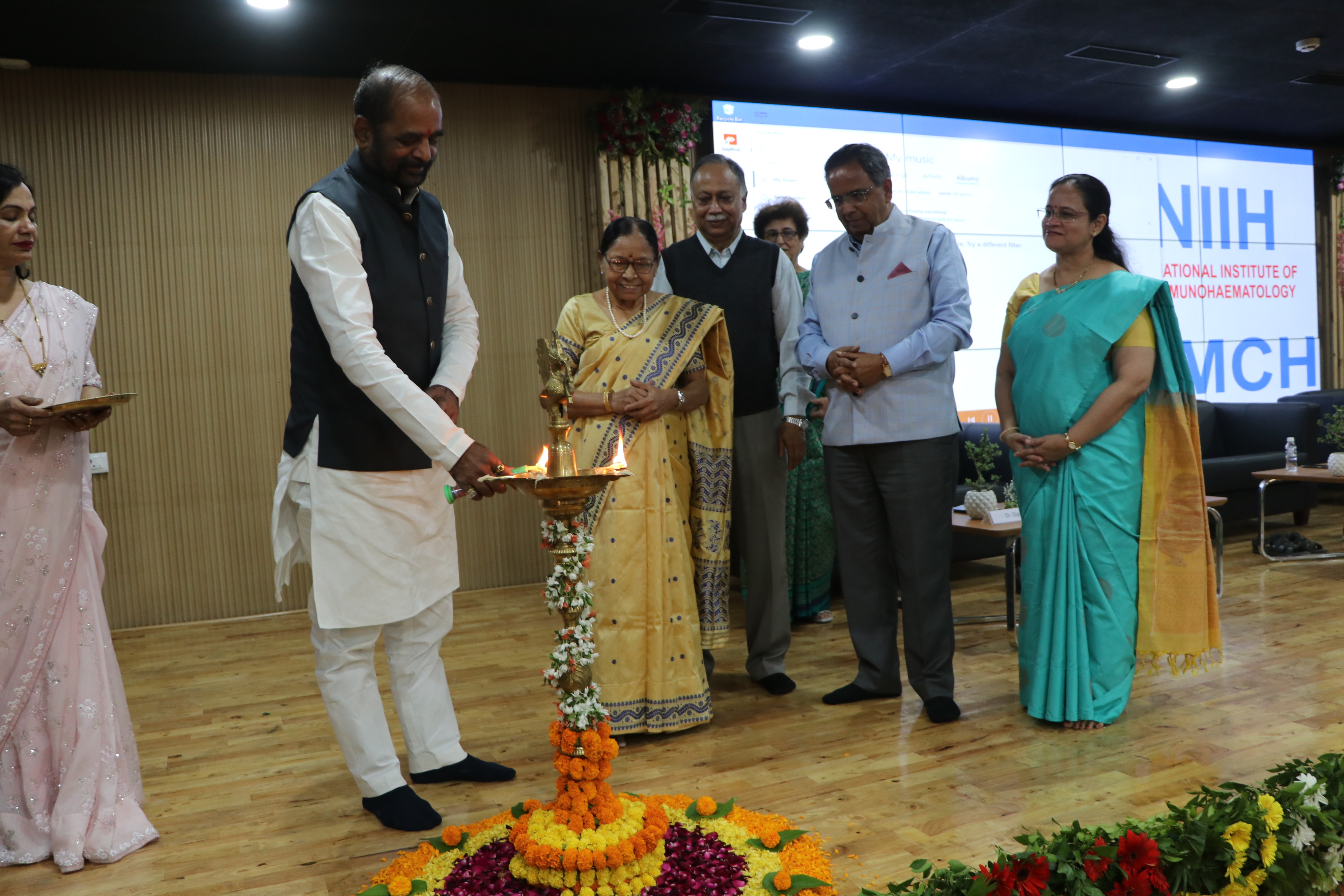 Lightning of Lamp during Post Inauguration Ceremony at ICMR-CRMCH Chandrapur with Shri Hansraj Ahir, Chairman of National Commission of Backward Classes and Former Union Minister of State and Home Affairs and Dr.Narinder Mehra, Indian Immunologist, Head SRL Limited, Gurgoan. Former Dean of AIIMS, New Delhi, along with all Ex-Directors of ICMR-NIIH on 11th December 2022.