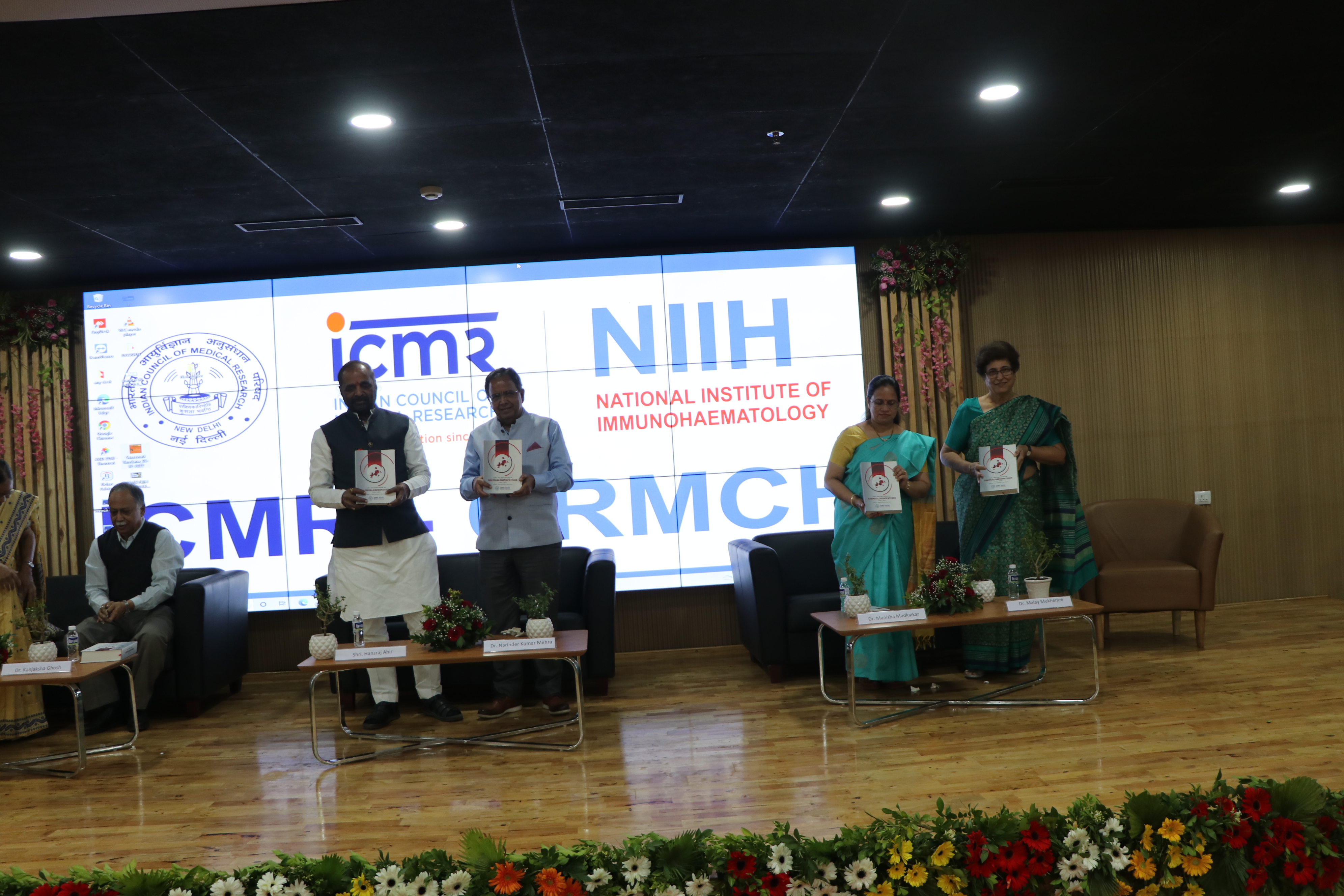 Release of Books during Post Inauguration Ceremony at ICMR-CRMCH Chandrapur with Shri Hansraj Ahir, Chairman of National Commission of Backward Classes and Former Union Minister of State and Home Affairs and Dr.Narinder Mehra, Indian Immunologist, Head SRL Limited, Gurgoan. Former Dean of AIIMS, New Delhi, along with all Ex-Directors of ICMR-NIIH on 11th December 2022.