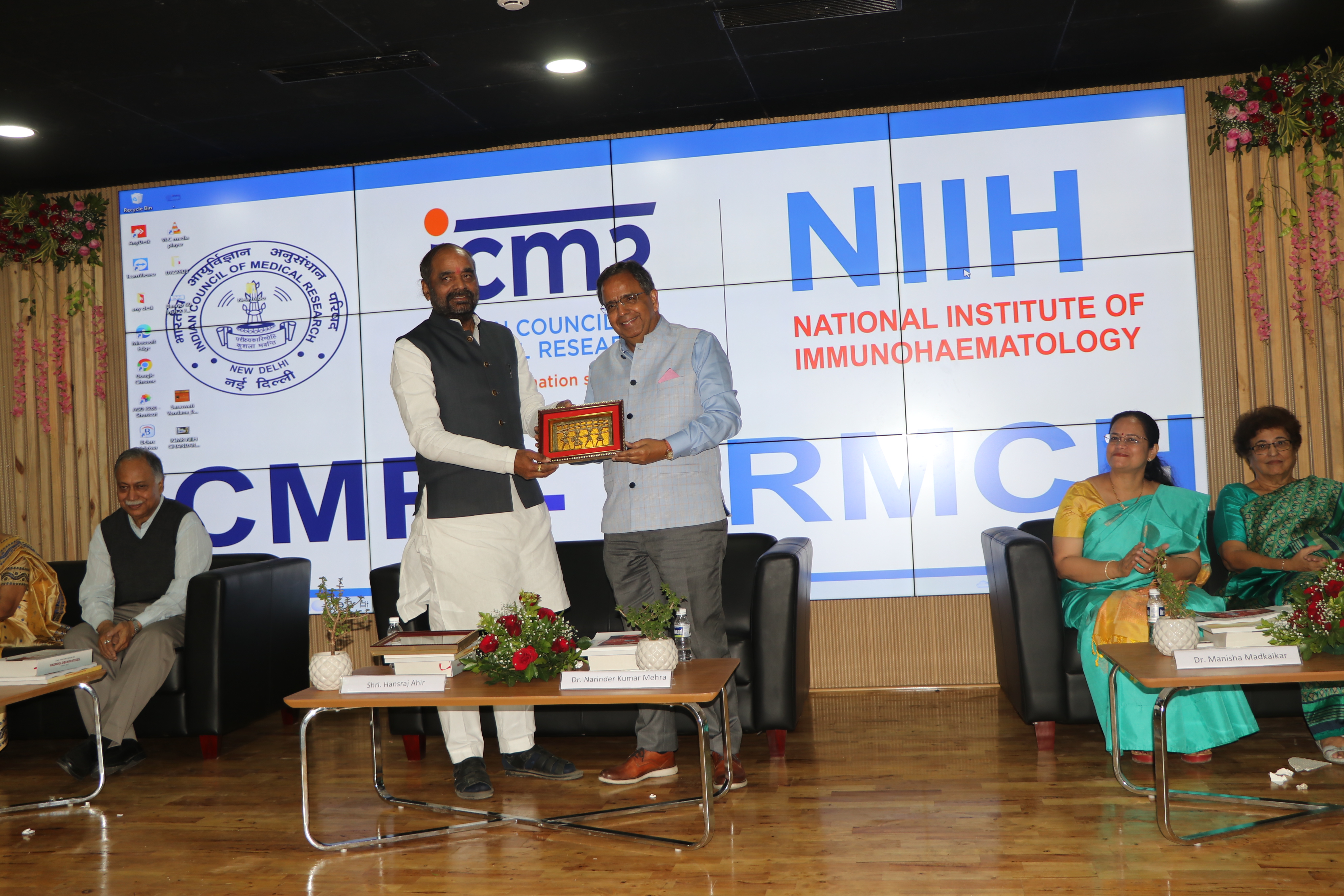 Shri Hansraj Ahir, Chairman of National Commission of Backward Classes and Former Union Minister of State and Home Affairs receives Momento by Dr.Narinder Mehra, Indian Immunologist, Head SRL Limited, Gurgoan. Former Dean of AIIMS, New Delhi during the Post Inauguration Ceremony of ICMR-CRMCH Chandrapur on 11th December 2022.